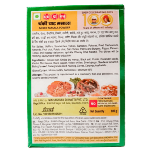 Ingredients: Iodised salt, unripe dry mango, black salt, cumin, coriander seeds, kachri, mint leaves, black pepper, yellow chillies, dried ginger, seedless tamarind, bishop’s weed, pomegranate seeds, nutmeg, cloves, caraway, asafoetida. Spice Content: Minimum 49%. Salt Content: Minimum 45% Allergen Information: This product is manufactured on machinery that also processes soy, sesame seeds, and mustard.